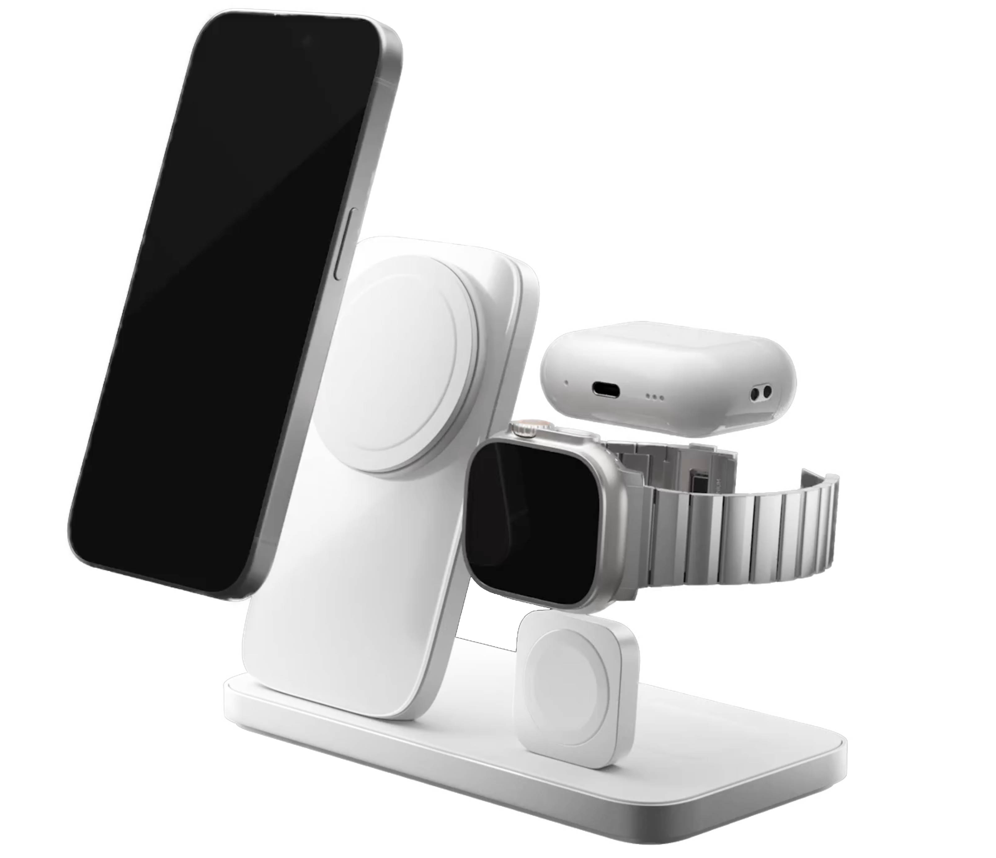 Dank neuster Wireless-Ladetechnologie nach Qi-2-Standard können die Devices jetzt mit bis zu 25 W schnell aufgeladebn werden. Das gilt natürlich nur für kompatible iPhones. AirPods und Watches können mit max. 5 W nachgetankt werden. Der Stand One Max bietet einen zusätzlichen Ladepunkt speziell für die Apple Watch.