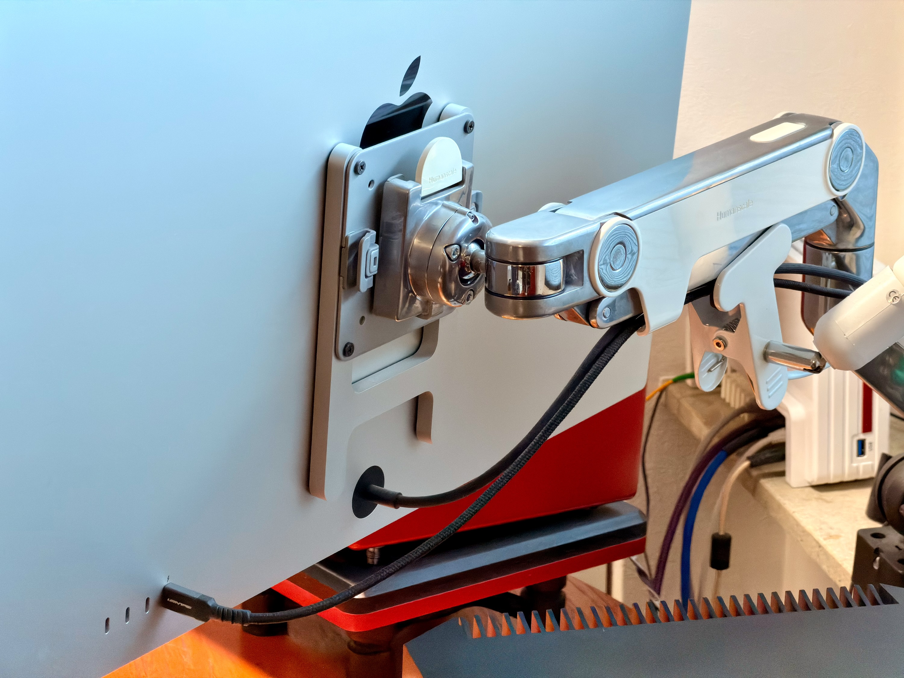 Nachteil Studio-Display: Eine VESA-Halterung muss extra bestellt werden und dann fällt der Standfuß komplett weg. Für das gleiche Geld erhält man nur eine H-Förmige Konstruktion auf der Rückseite, an der der VESA-Adapter angeschraubt werden kann. Standfußbetrieb ist damit nur möglich, wenn man sich von einem Drittanbieter einen Fuß mit VESA-Halterung kauft. Auch nicht so schön: Das Apple-Logo wird von der Montageplatte größtenteils verdeckt. Und das Stromkabel ist fest mit dem Display verbunden. Dafür kommt das Studio Display ohne den verhassten Teppich-Brikett aus.