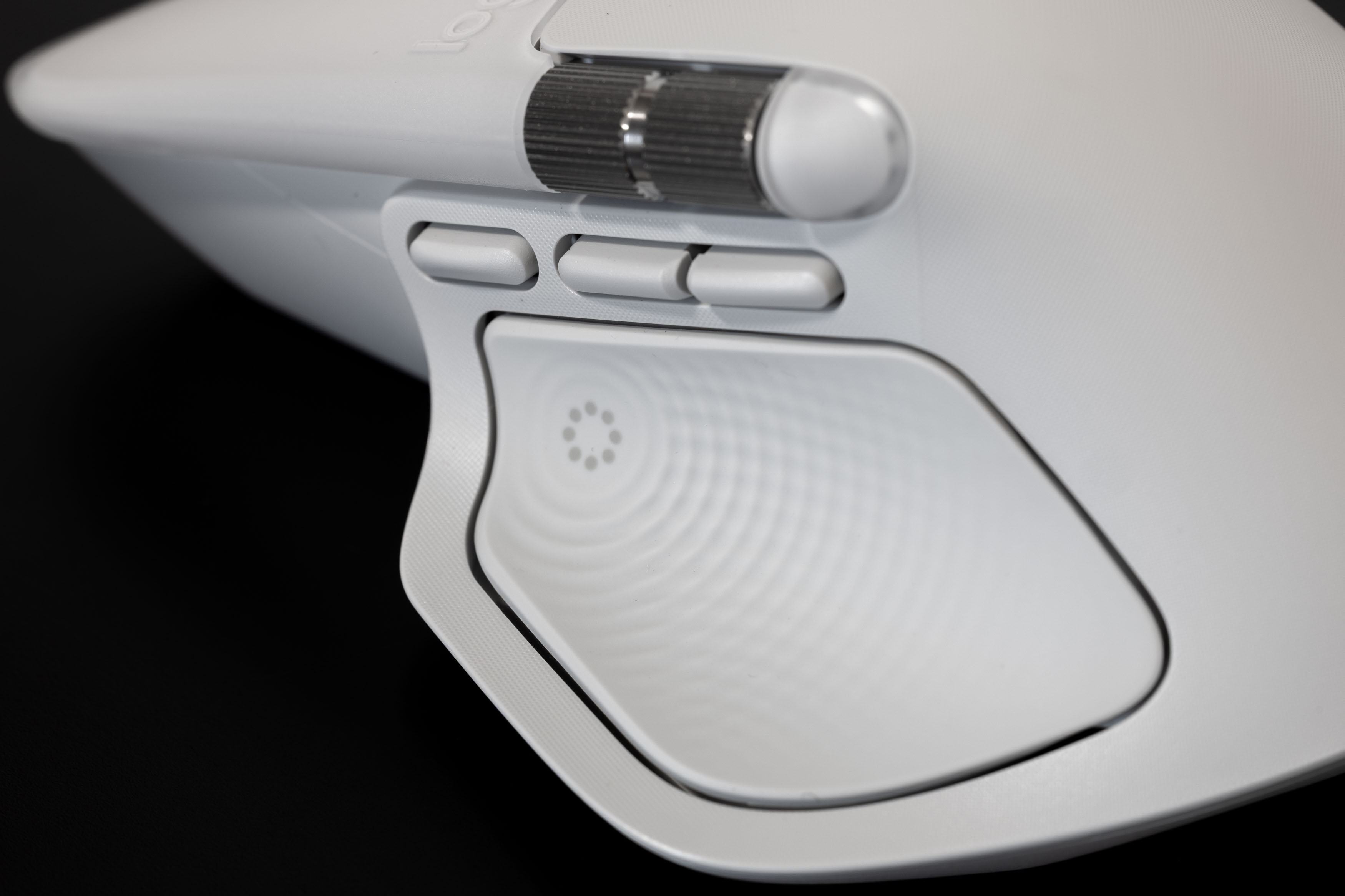 Die Daumentaste, also der Kontakt, liegt in der 3s unterhalb des Daumens. Zum Auslösen muss der Daumen leicht nach unten gedrückt werden, als wolle man die Hand leicht auf dem Daumen abstützen. Das funktioniert super komfortabel. Bei der MX 4 wird die Daumentaste unabhängig von der Richtung, in die man drückt, ausgelöst. Also nach unten, nach innen, weiter vorne oder weiter hinten. Das hat Logitech bestimmt als Verbesserung eingeführt, aber die Sache hat einen Haken.