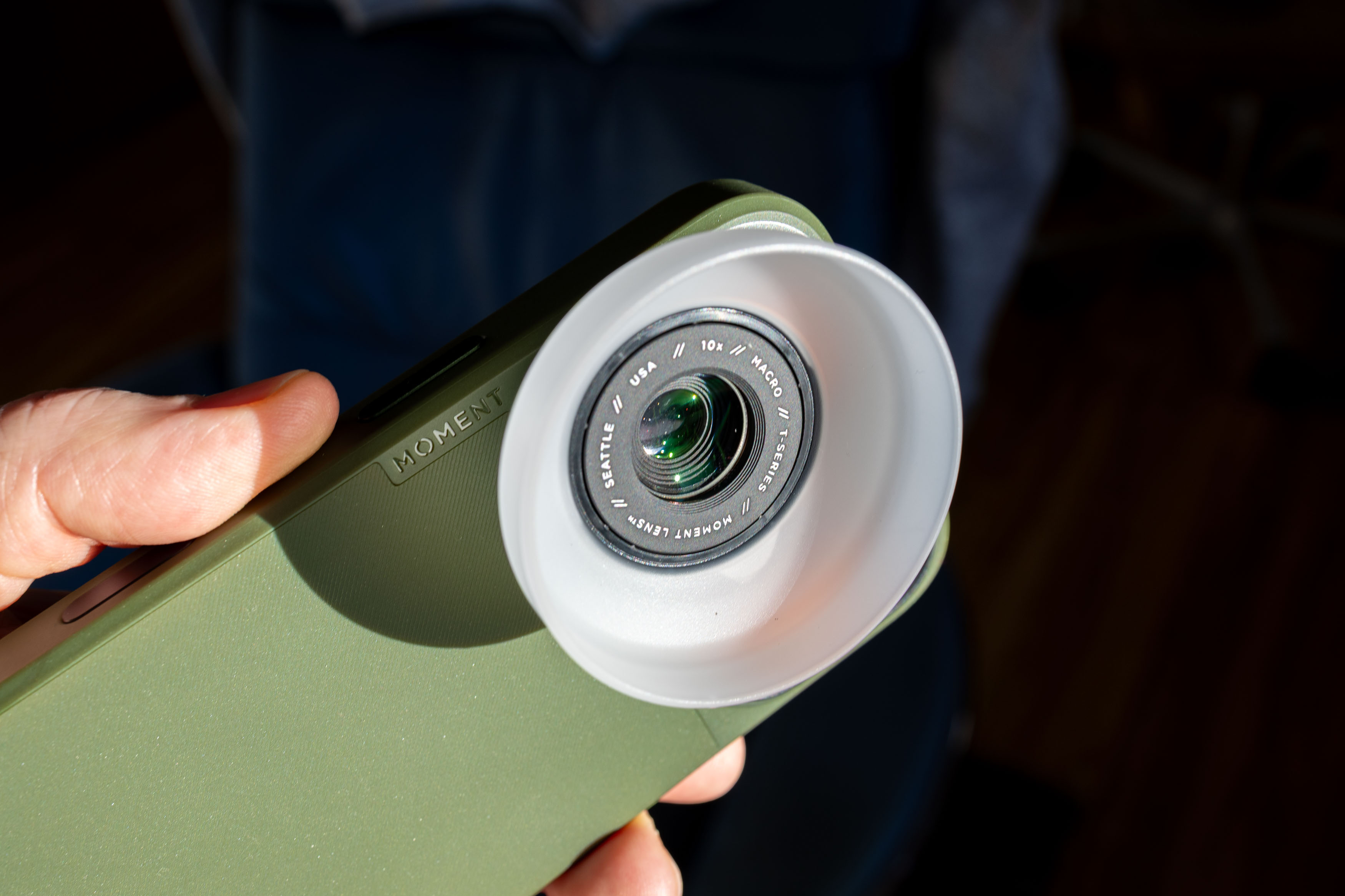 Das Test-SetDer deutsche MOMENT-Vertrieb SoulAr hat mir für diesen Test eine Art Starterkit zukommen lassen. Das besteht aus einem MOMENT Camera Case (in der Farbe Olive) und einem 10x-Makro-Objektiv. Zusätzlich wurde mir ein Einsatz zur Befestigung des Objektives an der Kamerahalterung zugeschickt, aber wie sich herausstellte, war das gar nicht nötig, weil diese (auswechselbare) Standardhalterung Bestandteil des Kamera-Case ist. Das Case mit Halterung kostet rund 85 Euro und das besagte Makro-Objektiv der „T-Series“ ist für 180 Euro via Amazon erhältlich.