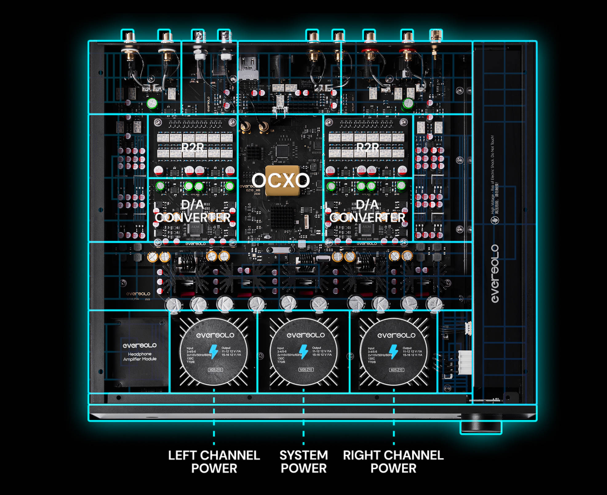 Die Technik: Ein Blick unter die HaubeDie Art und Qualität der Schaltung ist aus Verbrauchersicht eigentlich eher unwichtig. Hauptsache funktioniert wie gewünscht – könnte man salopp sagen. Aber was eversolo hier für 1.980 Euro verbaut hat, könnte als Lehrstück dienen und findet sich in ähnlich aufwendiger Form nur selten. Vor allem zu dem Preis.