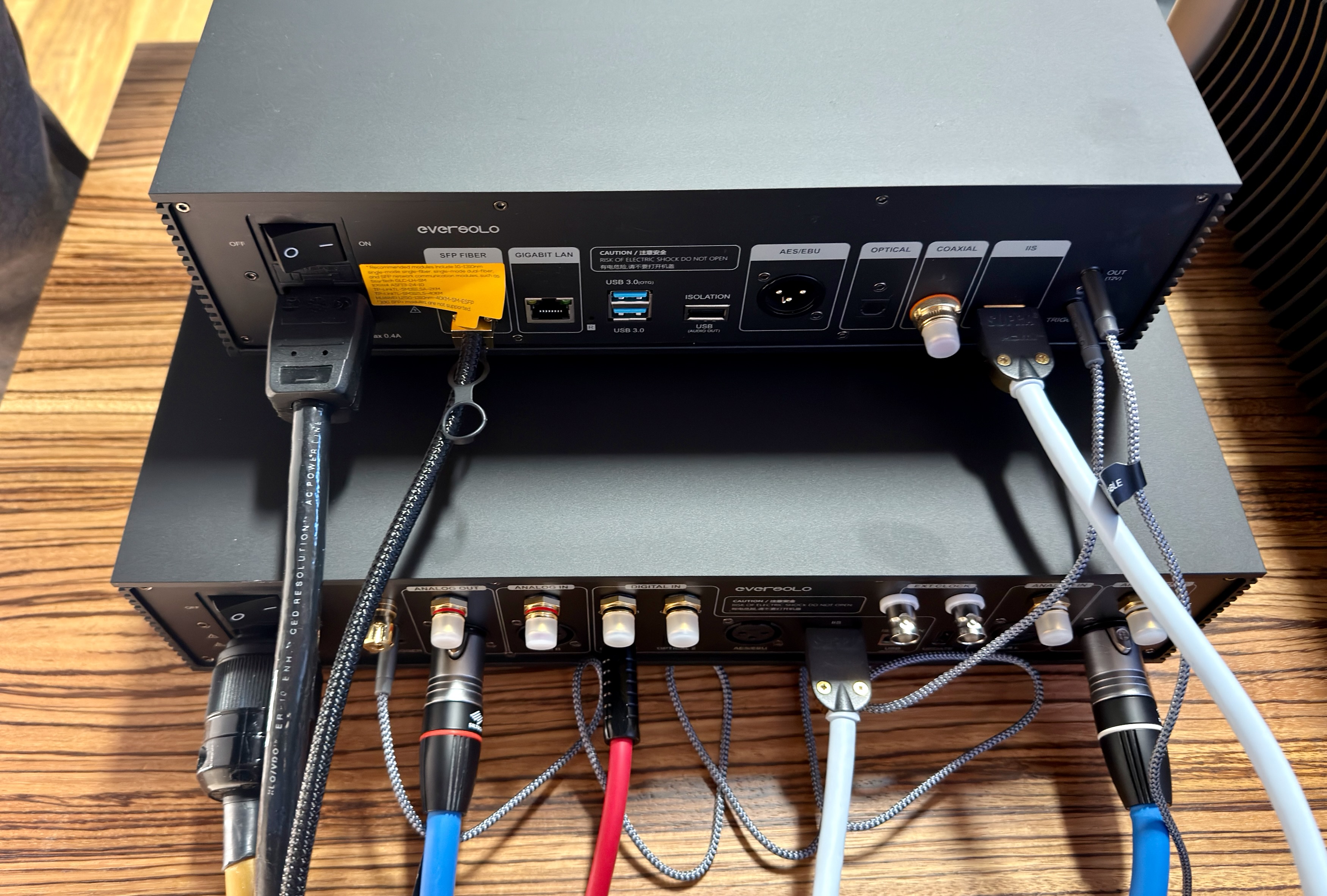 Der Z10 (unteres Gerät) hier zusammen mit dem eversolo T8, die via HDMI-I²S-Kabel verbunden sind. Außerdem ist ein TV per Toslink angeschlossen (HDMI ARC geht auch) und eine Endstufe per XLR. Der T8 ist hier mittels Direct Attach SFP-Kabel mit dem Netzwerk verbunden.