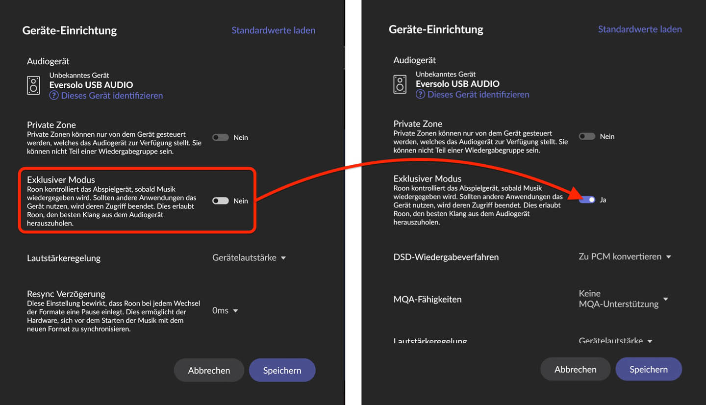 Noch ein wichtiger Hinweis für Roon-Nutzer, die den DAC Z10 per USB am Mac verwenden wollen. Schalten Sie in den Roon-Settings für das Gerät unbedingt den „Exklusiven Modus" an. Nur dann wird der Z10 auch bitperfekt bedient. Wenn der Z10 zu einem späteren Zeitpunkt mal das Label "Roon Tested" erhält, wird das wahrscheinlich automatisch aktiviert sein.