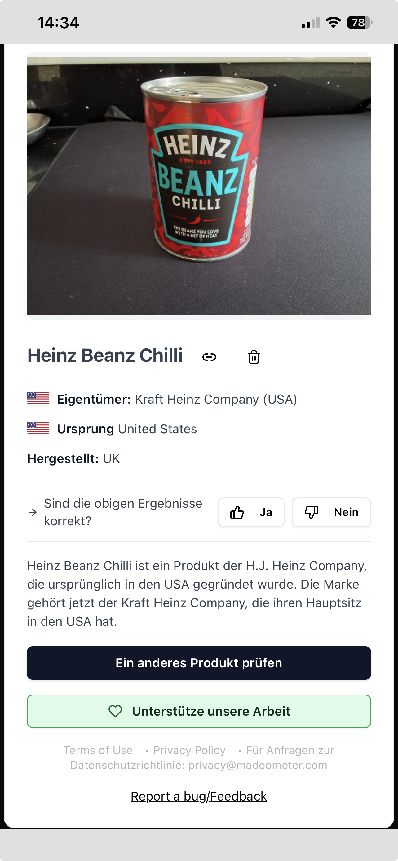 Made O'Meter – diese kostenlose App erlaubt zusätzlich zur Fotografie auch Texteingaben. Sie gibt Ursprung und Hersteller an, zusammen mit einer Beschreibung der Firmengeschichte. Dabei kommt ebenfalls Künstliche Intelligenz zum Einsatz. Lobend zu erwähnen ist, dass Made O'Meter laut eigenen Angaben keine Nutzerdaten erfasst und analysiert.