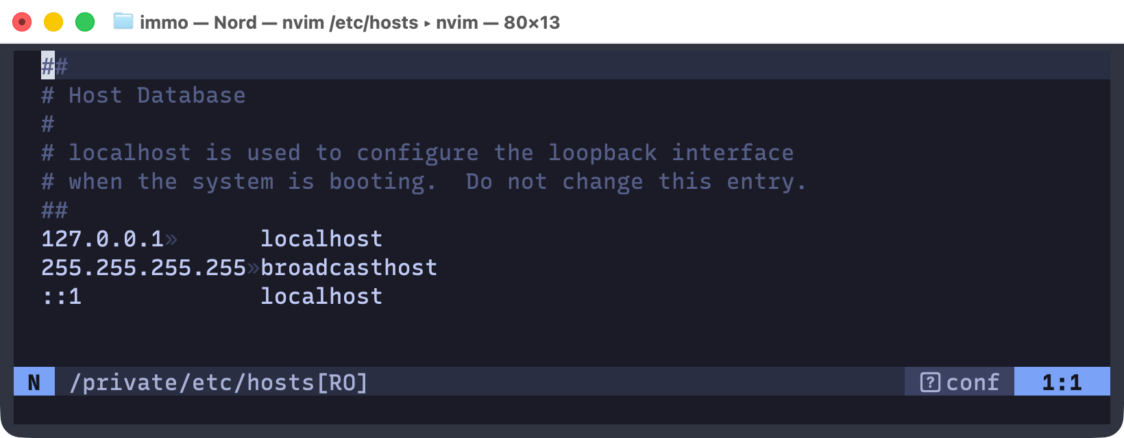 Eine unveränderte hosts-Datei von macOS – man beachte den Warnhinweis.