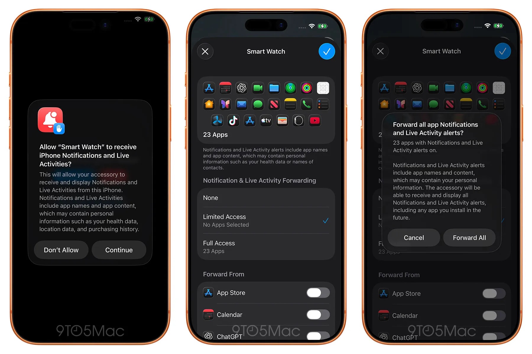 Apple testet erneut „Notification Forwarding“ für EU-NutzerUm den Vorgaben des Digital Markets Act gerecht zu werden, testete Apple bereits in vergangenen Beta-Versionen früherer Betriebssysteme einige Interoperabilitätsfunktionen. Diese kehren nun zurück: Einige Drittanbieter-Produkte wie Kopfhörer lassen sich ähnlich einfach wie AirPods mit dem iPhone koppeln. Benachrichtigungen werden an Zubehör wie Smartwatches weitergeleitet und Anwender haben die Möglichkeit, auf diese zu reagieren und auszuwählen, welche Apps Hinweise aussenden dürfen. Neu ist, dass Live-Aktivitäten erstmals von Drittanbietern synchronisiert werden können. Kopfhörer sollen zudem erkennen, ob das iPhone oder iPad als Audioquelle fungiert, und entsprechend automatisch umschalten.